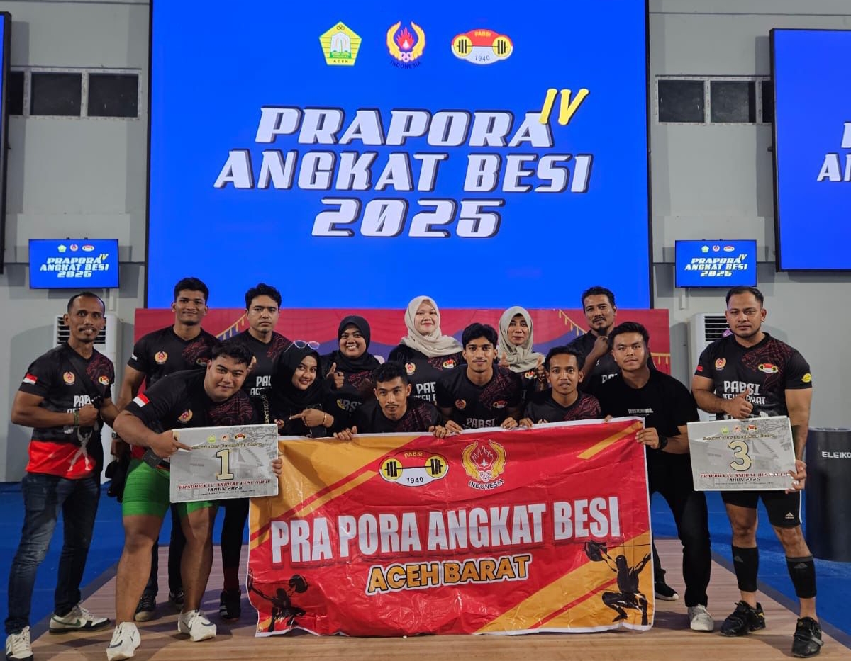 Kibaan.co | Aceh Barat : Aceh Barat resmi keluar sebagai juara umum Pra Pekan Olahraga Aceh (PORA) 2025 cabang angkat besi yang berlangsung di Stadion Harapan Bangsa, Banda Aceh pada Minggu (23/11/2025). Kontingen Aceh Barat tampil dominan lewat torehan empat medali emas dan satu perunggu, hasil kerja keras para lifter putra dan putri yang turun di berbagai kelas pertandingan.