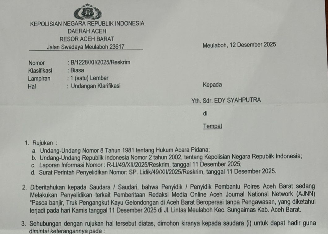Pemanggilan tersebut tertuang dalam surat bernomor :B/1228/XII/2025/Reskrim yang tujukan kepada Edy Syahputra untuk memberikan klarifikasi terkait persoalan tersebut.